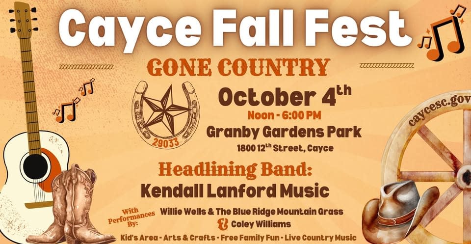 The City of Cayce is excited to announce the live music line-up for the 2025 Cayce Fall Fest! The popular live music festival will return to Cayce on October 4 from 12 pm - 6 pm at Granby Gardens Park, located at 1800 12th Street in Cayce. Join in on the fun with live music, food vendors, craft vendors and a kid’s area with face painters, balloon artists, inflatables, and more! This year’s music lineup includes West Columbia native, Coley Williams; Willie Wells and the Blue Ridge Mountain Grass; and headliner, Kendall Lanford Music! This event is FREE and open to all, including friendly pets! 🐶🎶