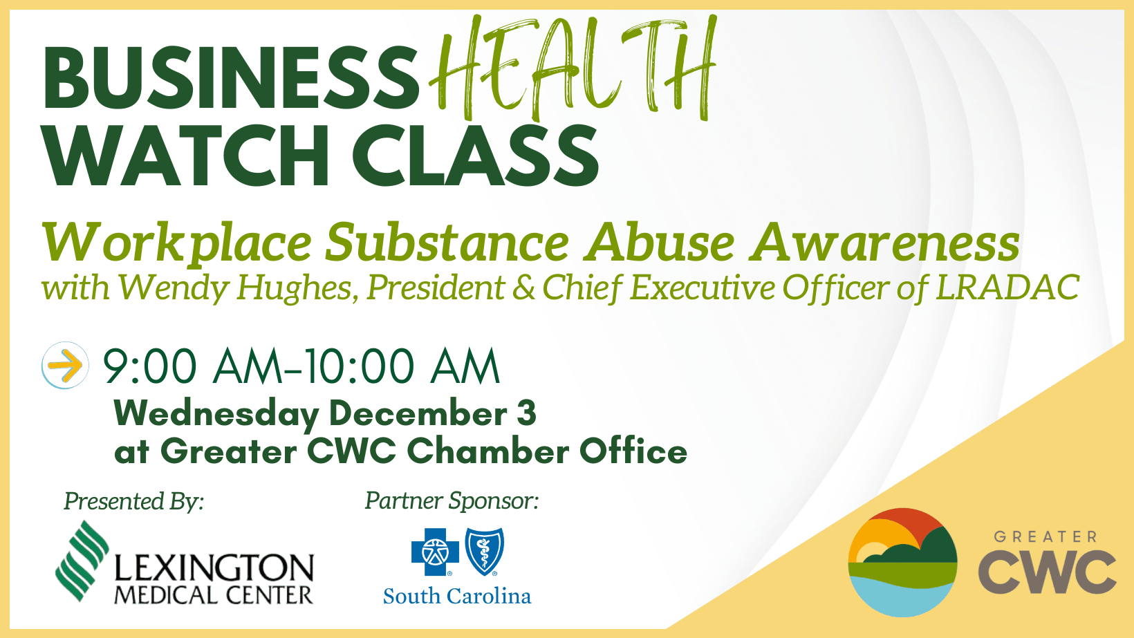 Substance misuse doesn’t just affect individuals — it impacts entire workplaces and communities. Join us for an important session on Workplace Substance Abuse Awareness led by Wendy Hughes, President and CEO of LRADAC, the designated alcohol and drug abuse authority for Lexington and Richland Counties.